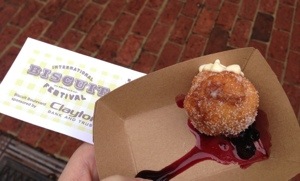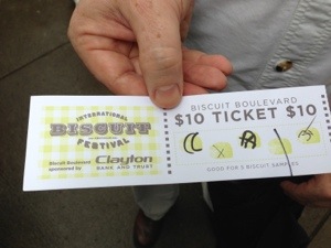 We moved back and forth among the lines of booths until at some point we realized that we could not move at all. The lines had gotten so long and the crowd so thick that you could not tell where one started and another ended. Still, there were biscuits to be tasted. We bought a third and final ticket for our last selections and got into one of the longest lines with an elaborate biscuit at the end of it. The line stretched around the corner and about a block down the side of the building. It was, ironically, kind of a relief to be out of the crush of humanity on the main drag. Eventually, we made it through the line for that biscuit and our remaining spots in our ticket were filled quickly.